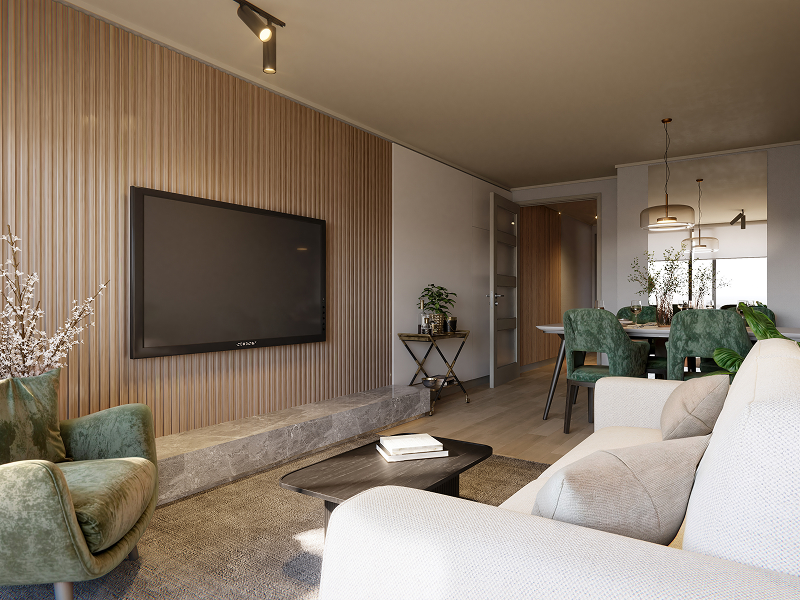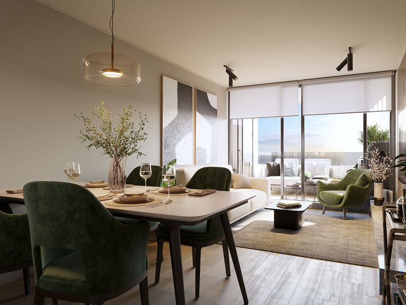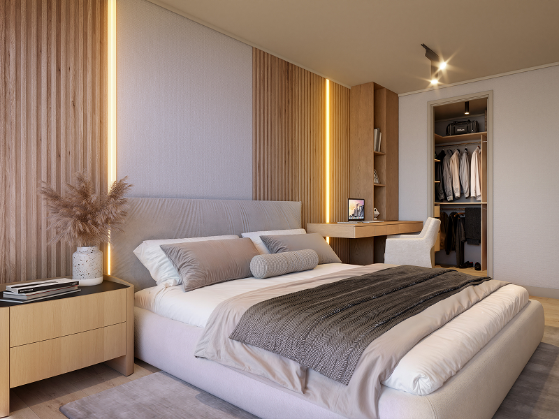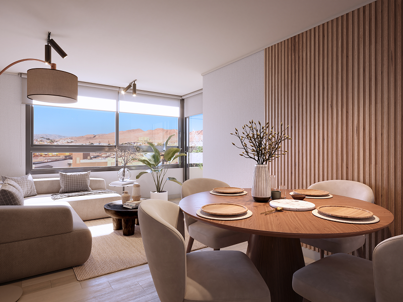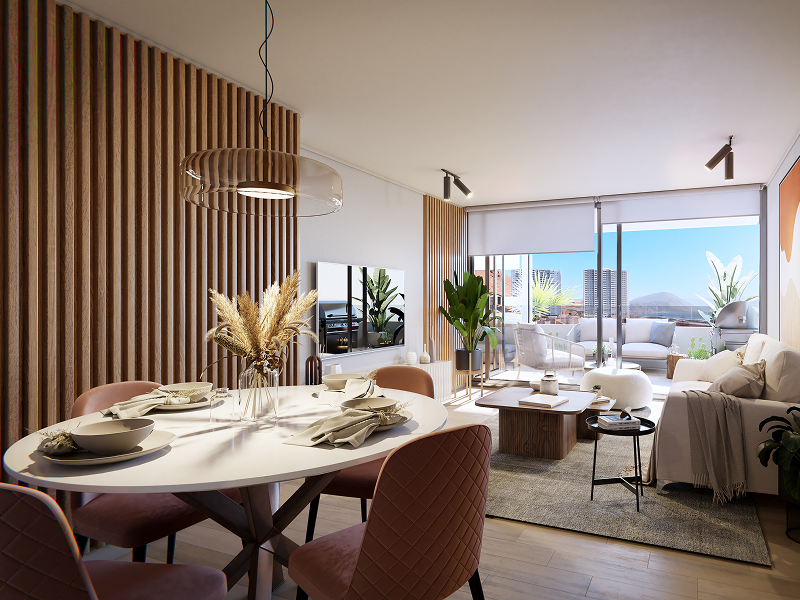 Cada detalle en el diseño interior de los departamentos ha sido pensado para transmitir esa misma calma, con materiales nobles y una paleta de colores neutros pero cálidos: grises, beiges y tonos arena.