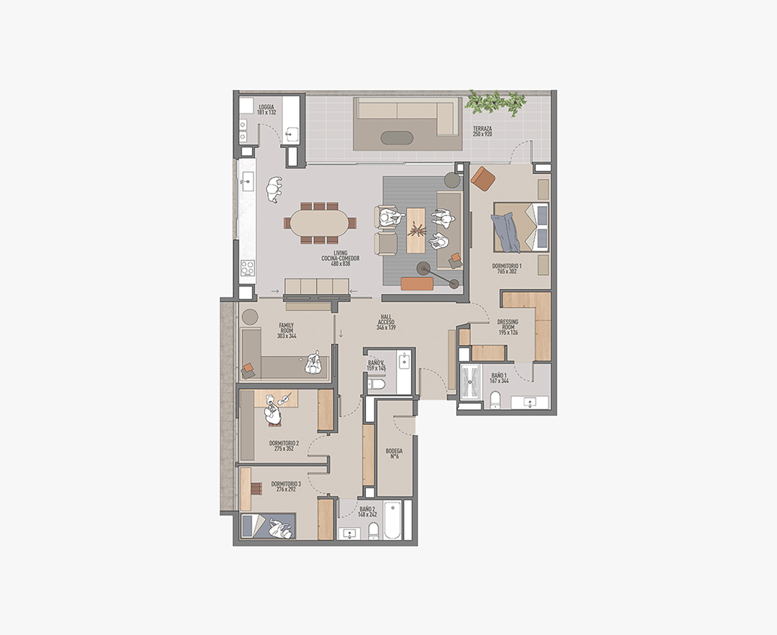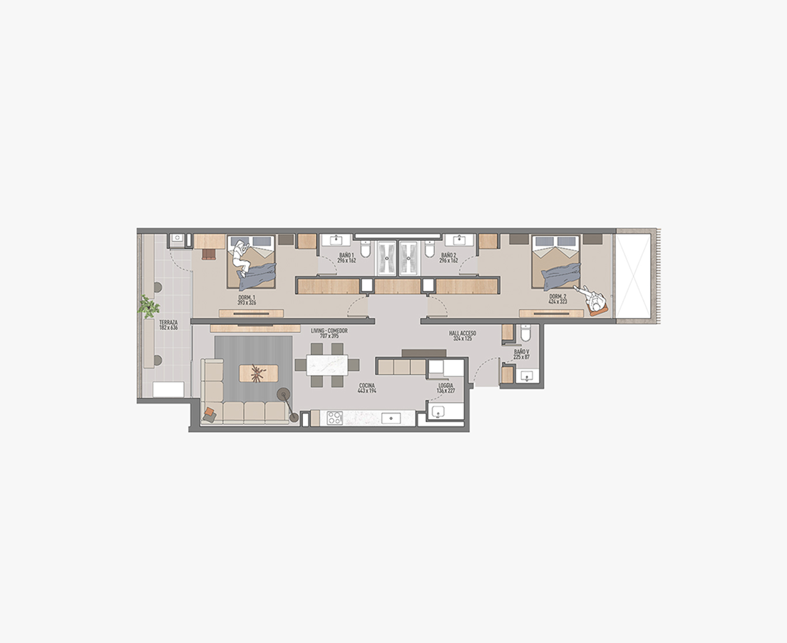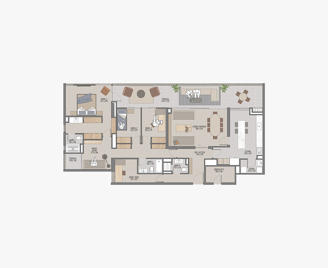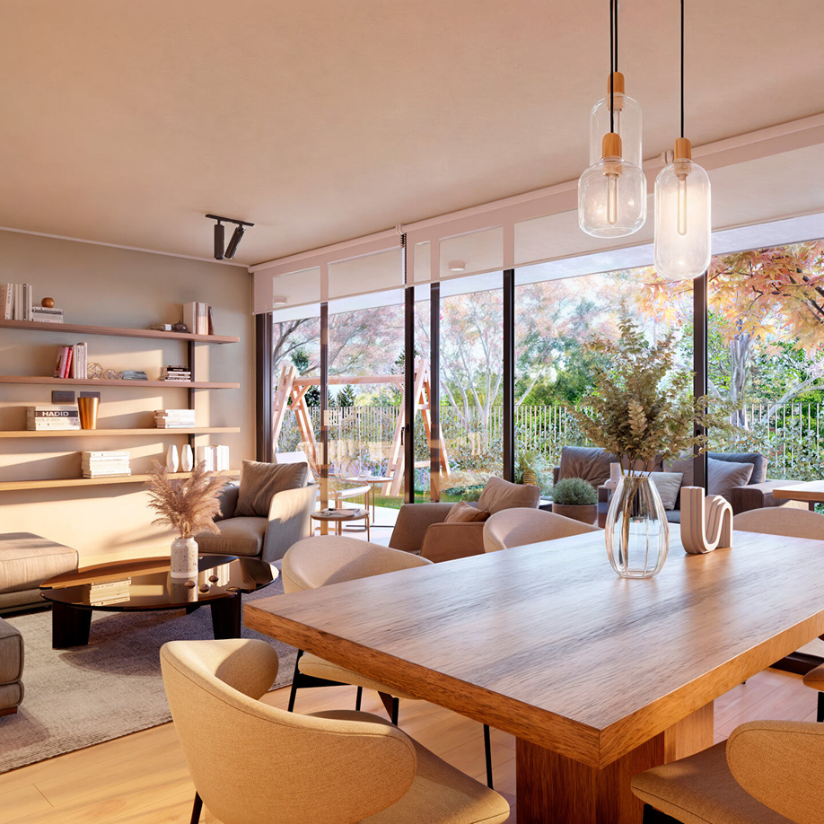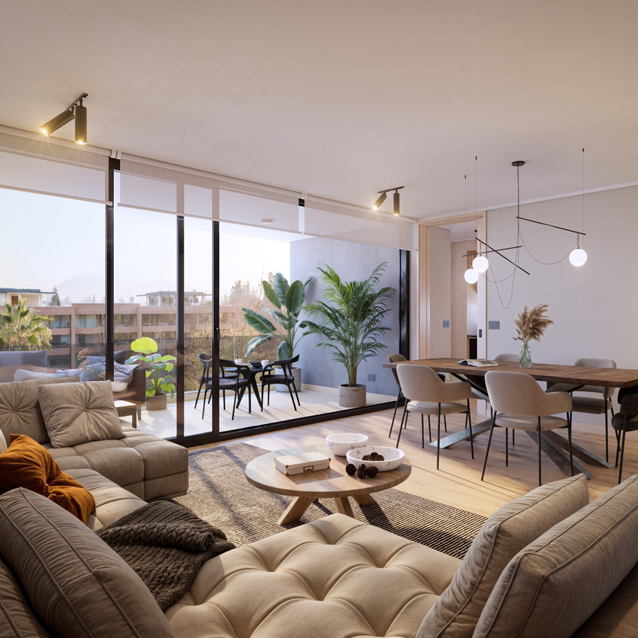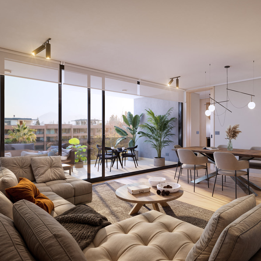 Creamos espacios amplios y versátiles donde la luz natural y la comodidad son protagonistas. Nuestros departamentos cuentan con puertas correderas para adaptarse a tus necesidades de integración o independencia. Desde la terraza hasta la cocina, cada área social está diseñada para el disfrute en familia, mientras que los dormitorios ofrecen tranquilidad y espacio para un descanso reparador.