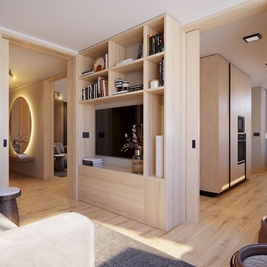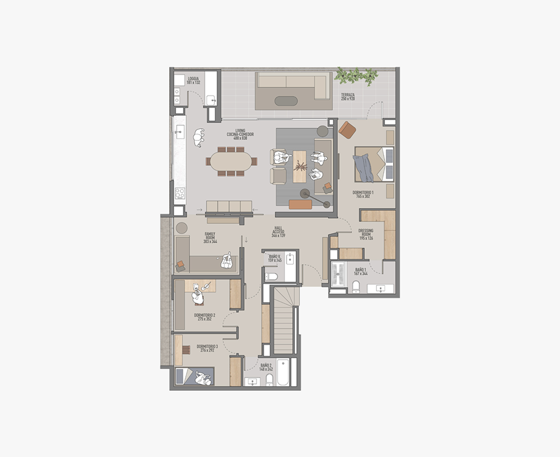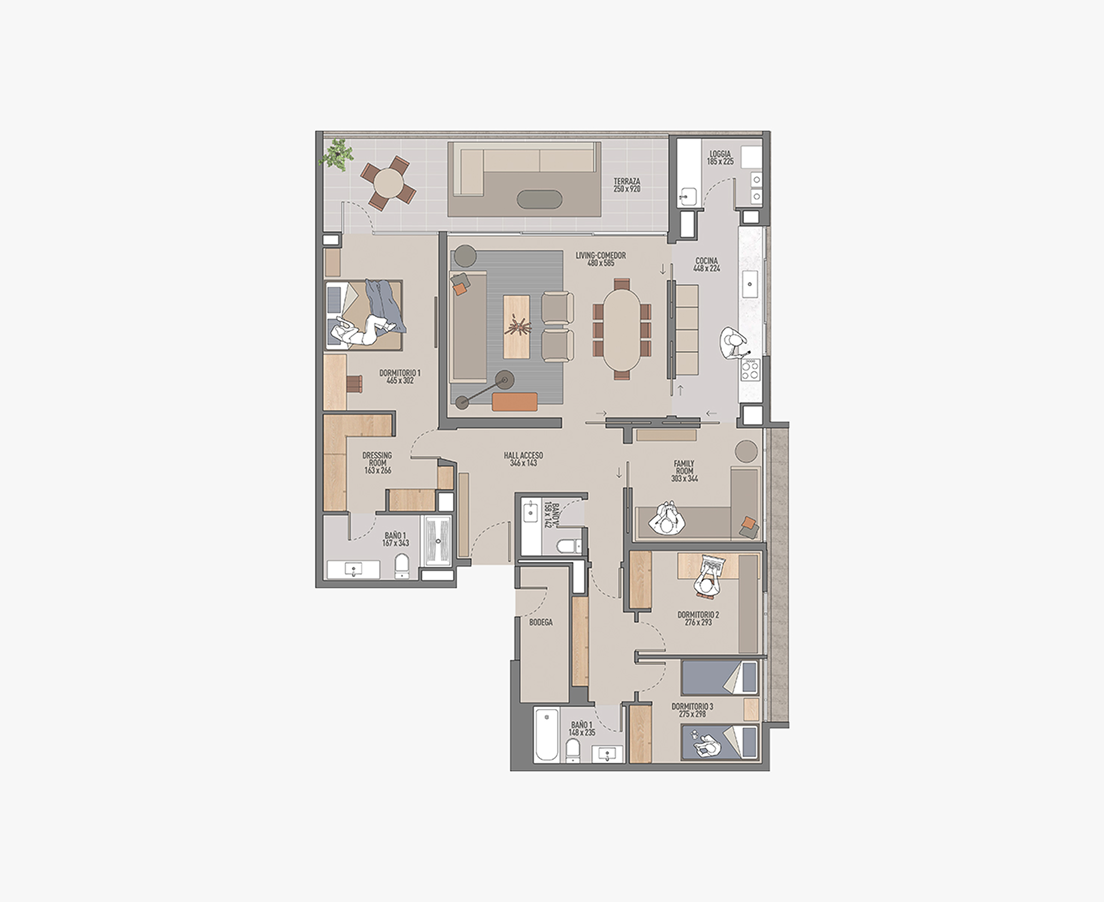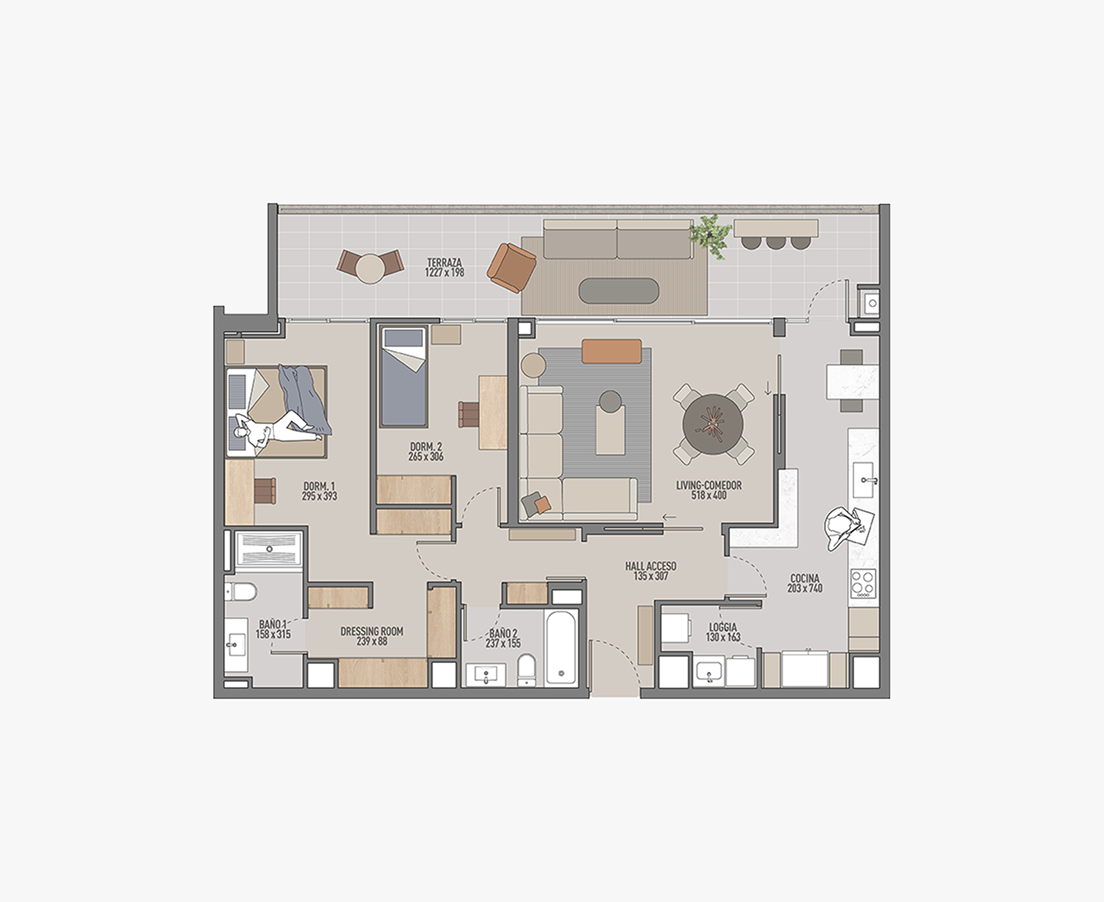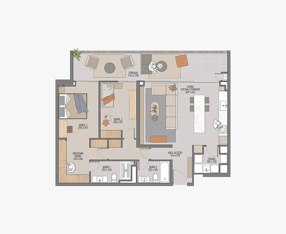 Creamos espacios amplios y versátiles donde la luz natural y la comodidad son protagonistas. Nuestros departamentos cuentan con puertas correderas para adaptarse a tus necesidades de integración o independencia. Desde la terraza hasta la cocina, cada área social está diseñada para el disfrute en familia, mientras que los dormitorios ofrecen tranquilidad y espacio para un descanso reparador.